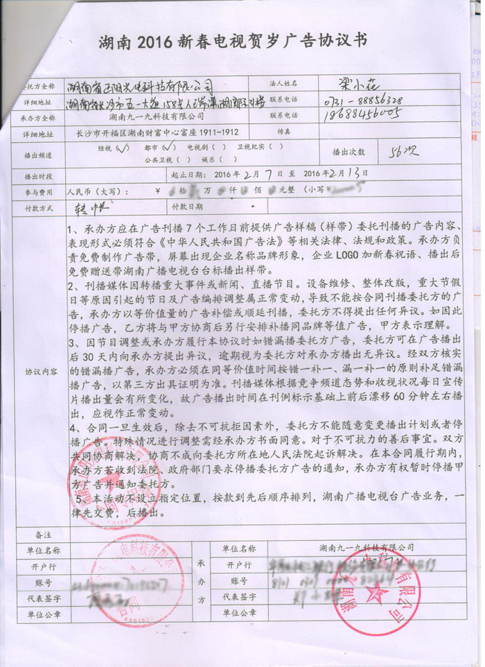 2016年1月9日,湖南省正陽光電科技有限公司與湖南九一九科技有限公司簽約受理湖南省正陽光電科技有限公司2016年新春電視賀歲廣告,在2016年2月7日至2016年2月13日,請鎖...