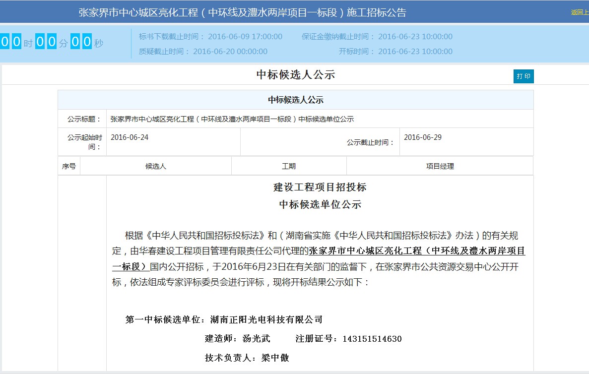熱烈祝賀湖南正陽成功中標(biāo)張家界市中心城區(qū)亮化工程(中環(huán)線及澧水兩岸項目一標(biāo)段)[2016-06-25]