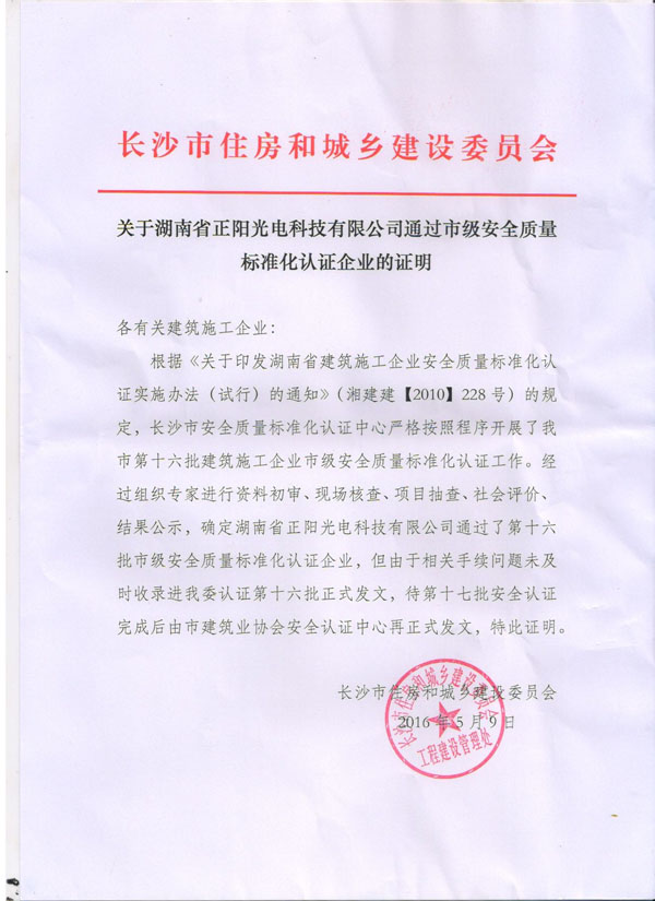 ?2016年5月24日,湖南省正陽光電科技有限公司榮獲“安全質(zhì)量標準化認證企業(yè)”稱號!